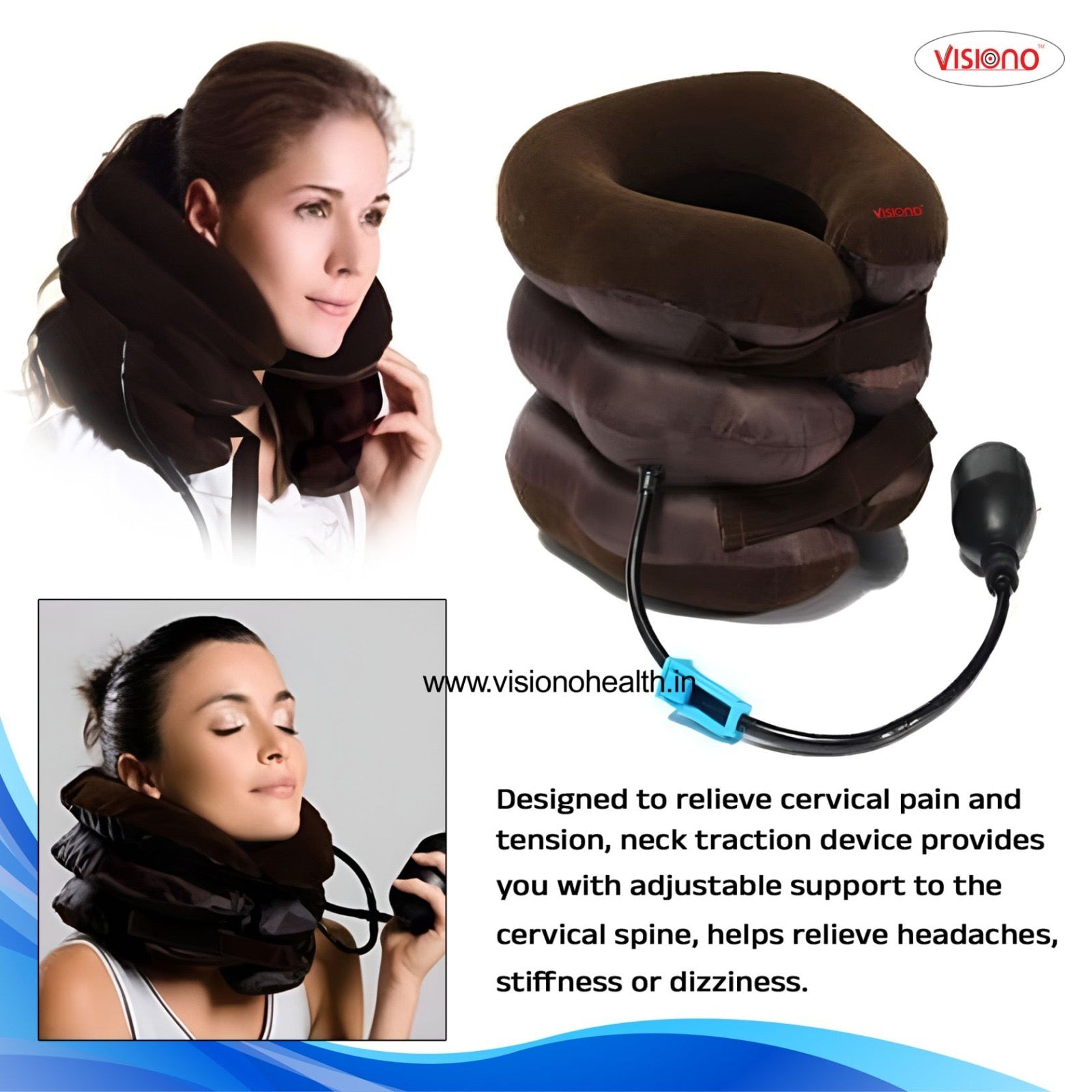The Visiono Inflatable Cervical Neck Traction Device is specially designed to relieve cervical pain, neck stiffness, and muscle tension. This ergonomic neck support gently stretches and decompresses the cervical spine, helping improve blood circulation and posture. Regular use may help reduce headaches, dizziness, and stress caused by long working hours or poor posture.