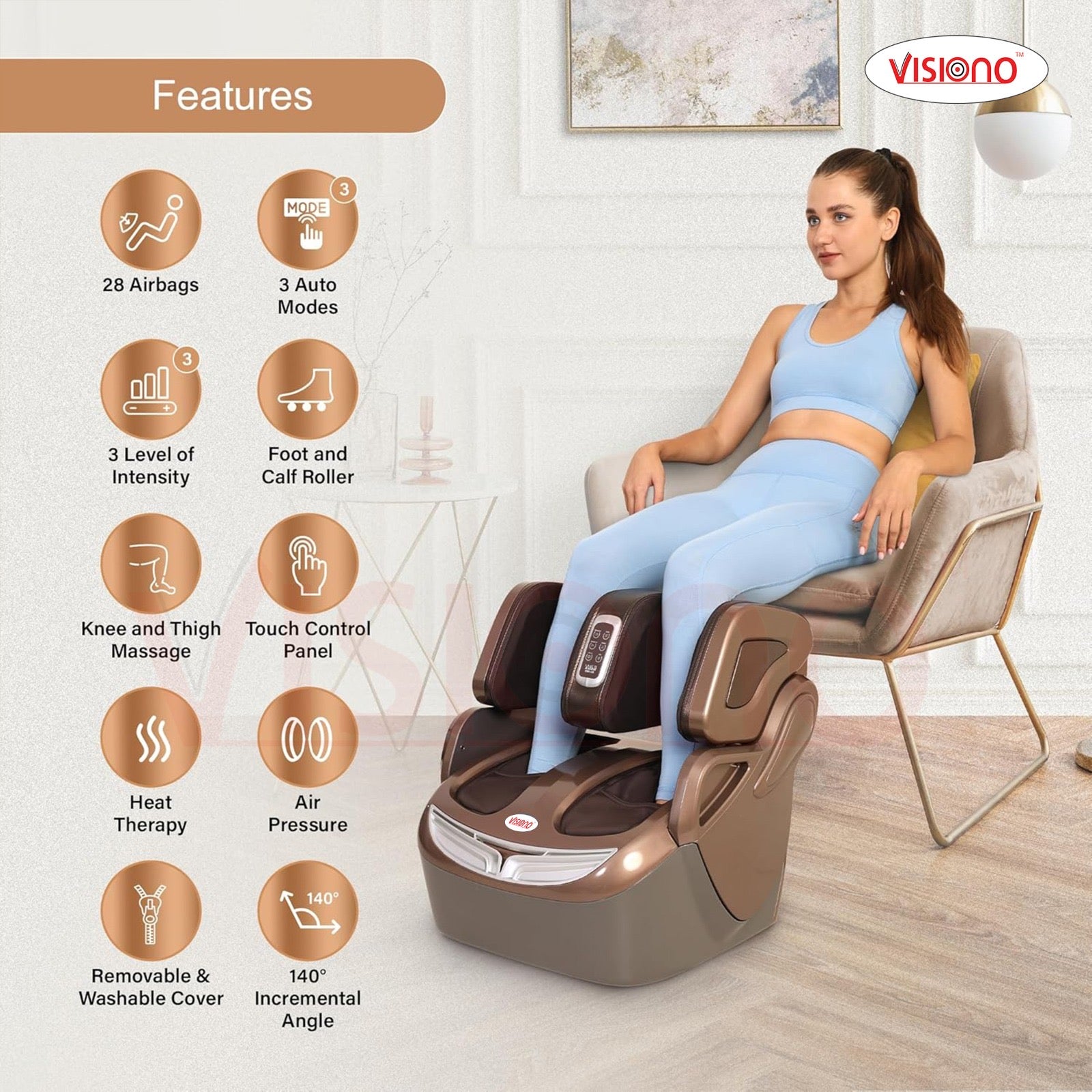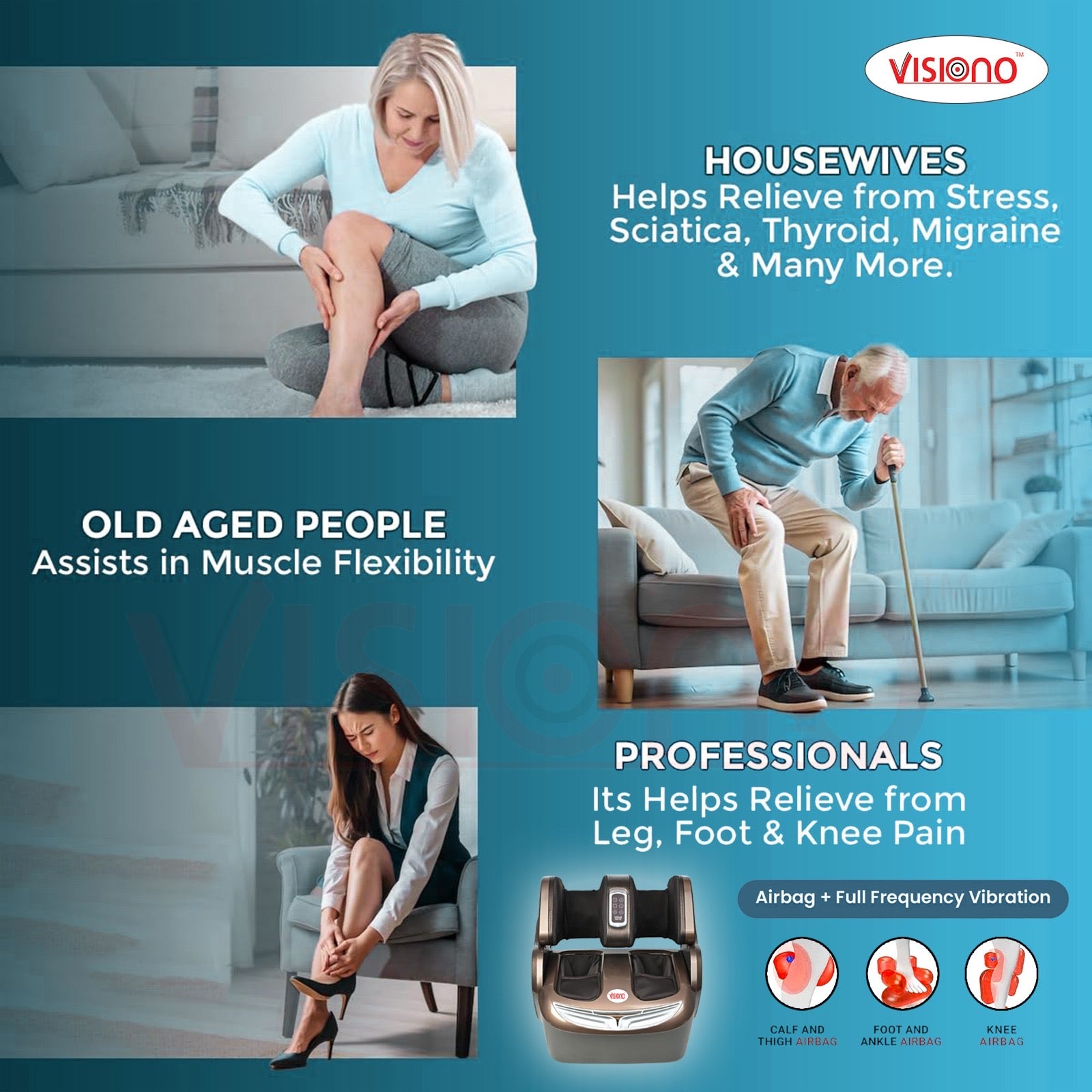 The VISIONO Advanced Foot & Calf Massager is a patented, industry-leading therapy device designed to deliver complete relaxation and pain relief for feet, calves, knees, and lower legs. Featuring an exclusive 3D Roller Calf Massage Mechanism, it provides deep yet gentle massage to relieve daily fatigue and muscle tension.