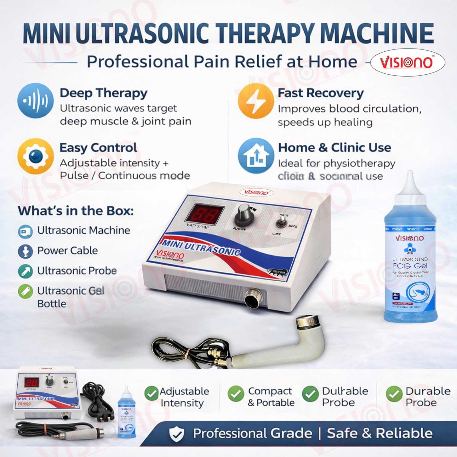 The Visiono Mini Ultrasonic Therapy Machine is a compact and effective physiotherapy device designed for pain relief, muscle relaxation, and faster recovery. It uses advanced Ultrasonic Therapy Technology to deliver deep heat into tissues, helping to reduce pain, inflammation, and stiffness.
