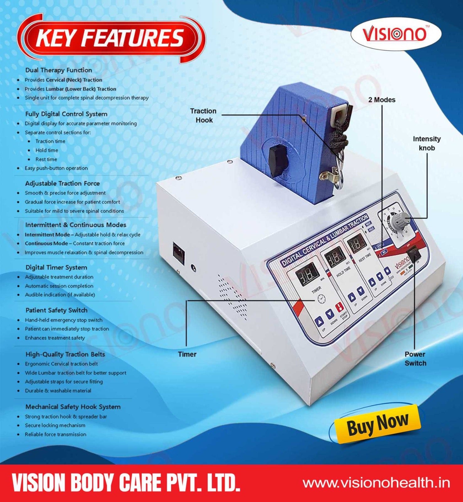 The VISIONO Digital Cervical & Lumbar Traction Unit is a microcontroller-based spinal decompression system engineered to deliver precise, controlled, and repeatable traction therapy for both cervical and lumbar regions. The unit is designed for clinical environments including physiotherapy centers, rehabilitation clinics, and hospitals.