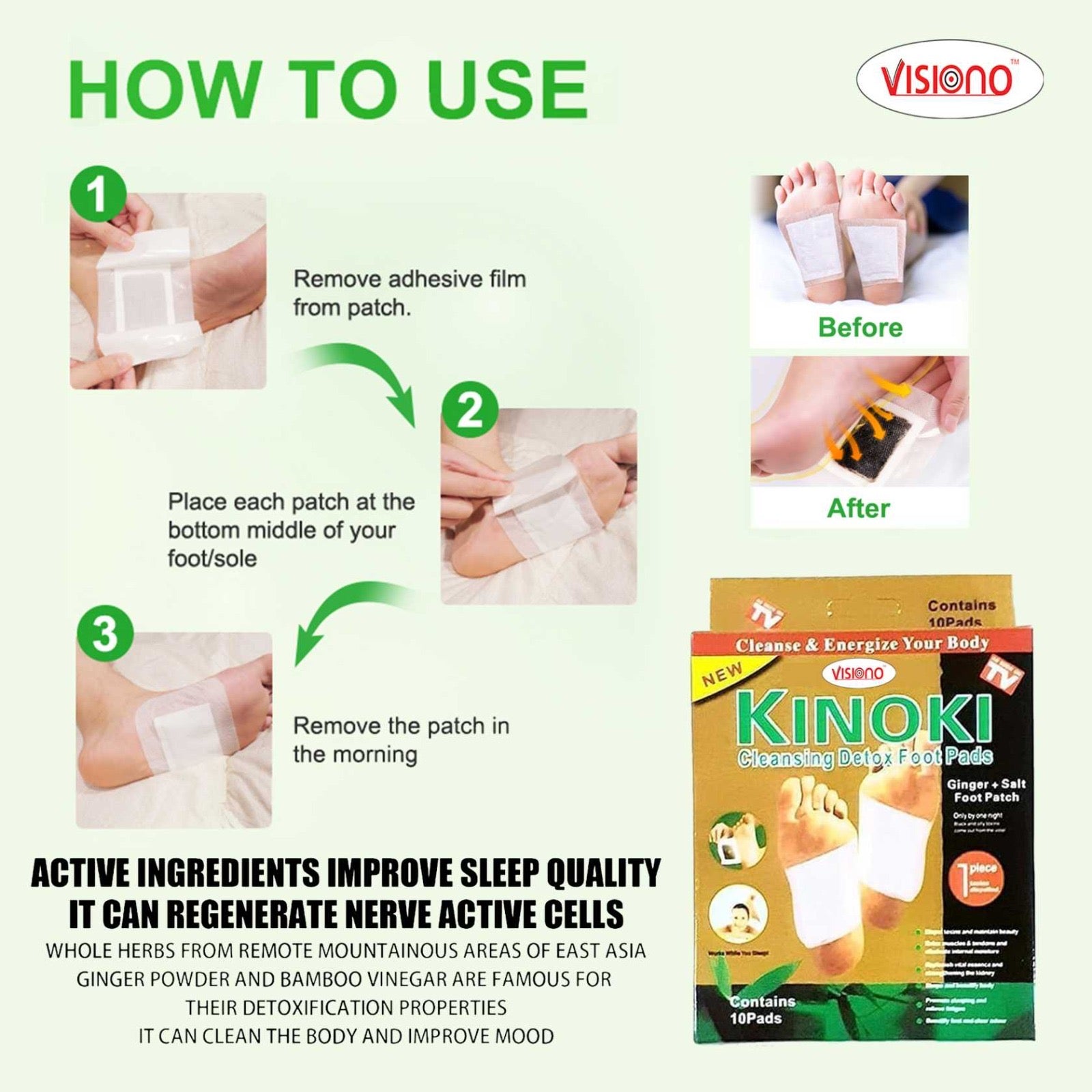 The Visiono Detox Foot Patch is a natural wellness solution designed to help refresh and relax your body while you sleep. Made with traditional herbal ingredients, these foot patches are applied to the soles of the feet at night, where they work to draw out impurities and promote a sense of balance and comfort by morning.